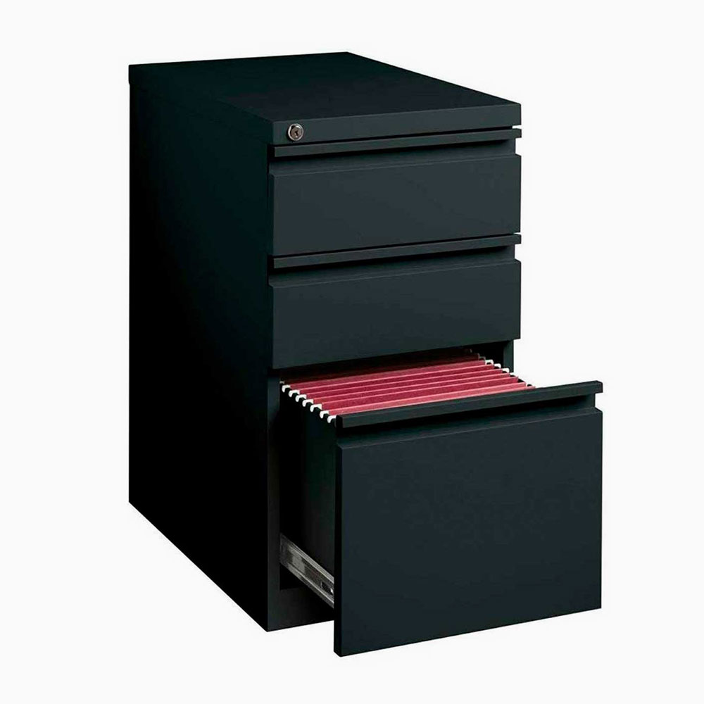 Archivero móvil metalico, de dos cajones papeleros y uno de archivo, corredera de extensión, jaladera a lo largo del frente del cajón, incluye cerradura general y rodajas ocultas, medidas de 38.10 x 50.80 x 70.48 cm de altura.